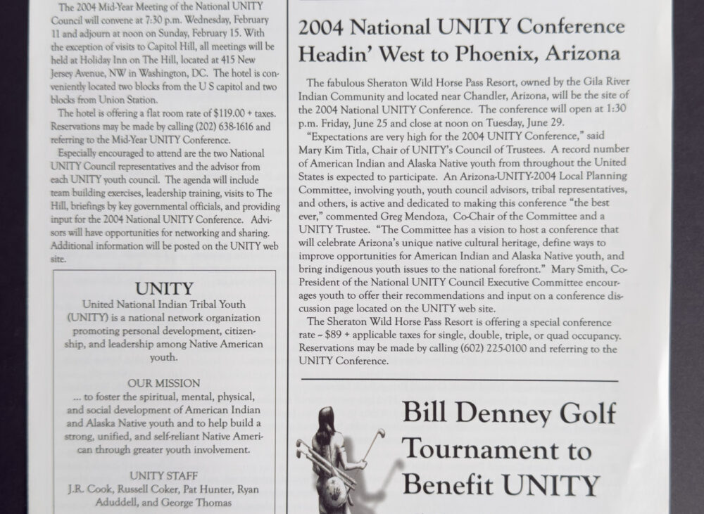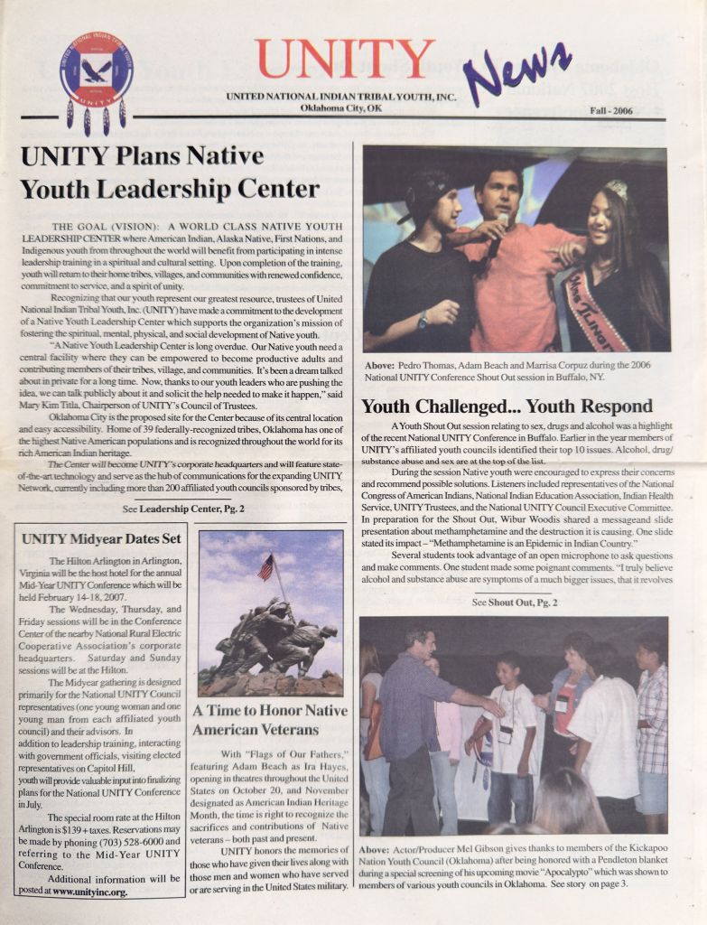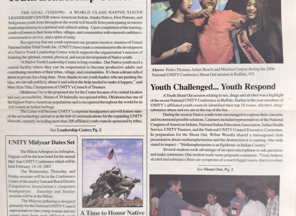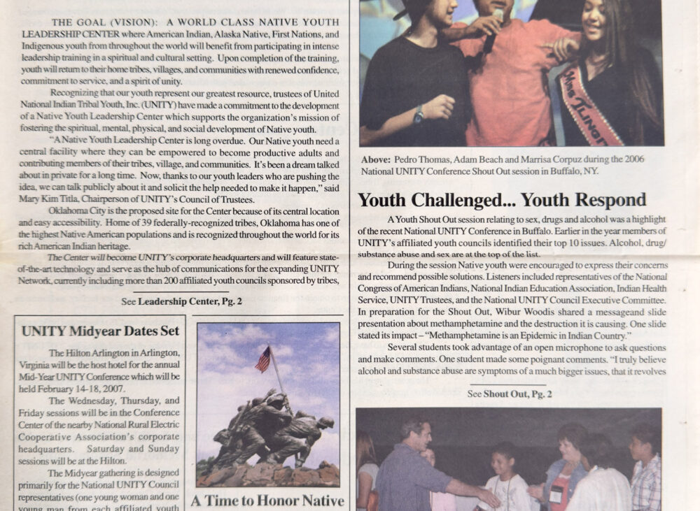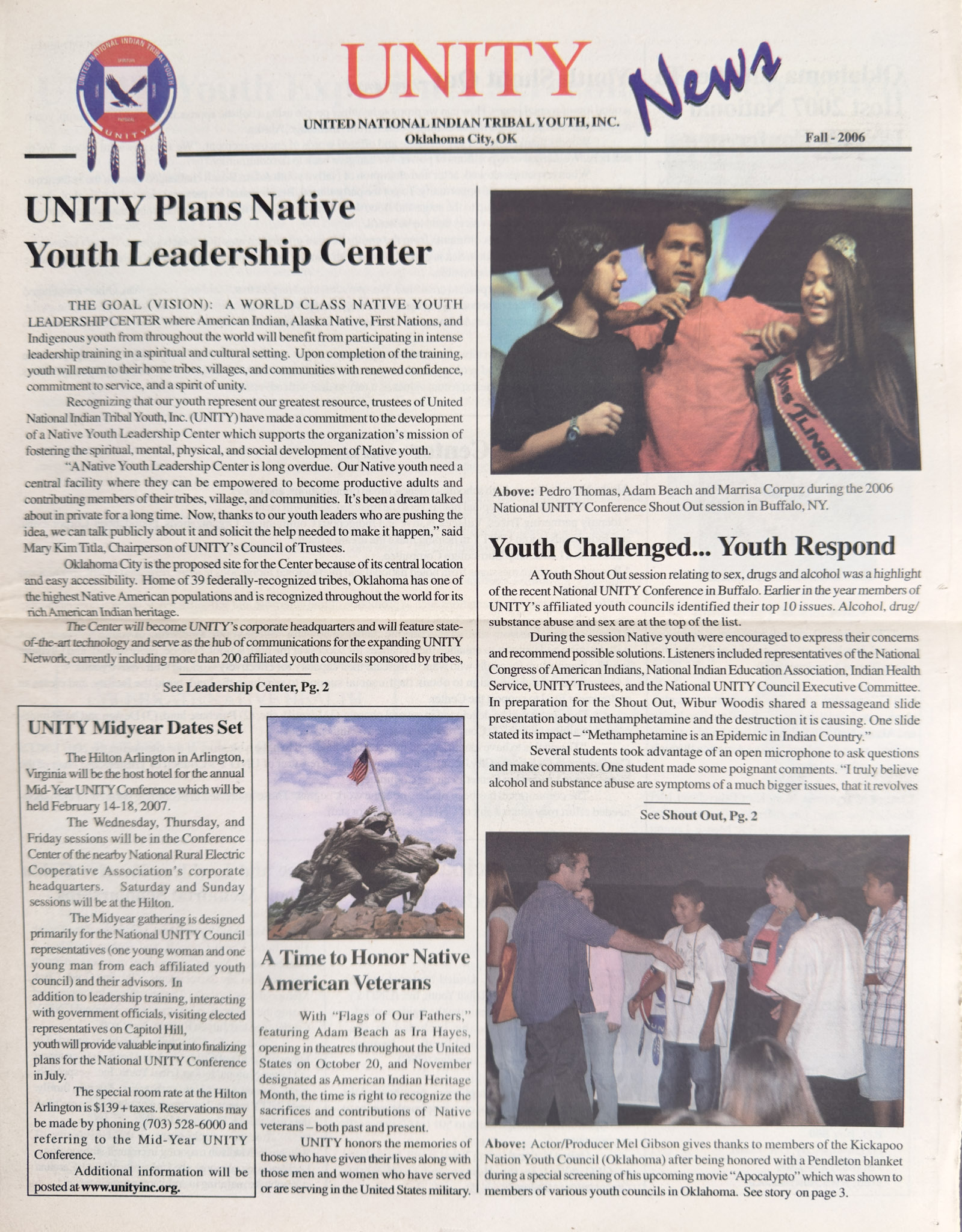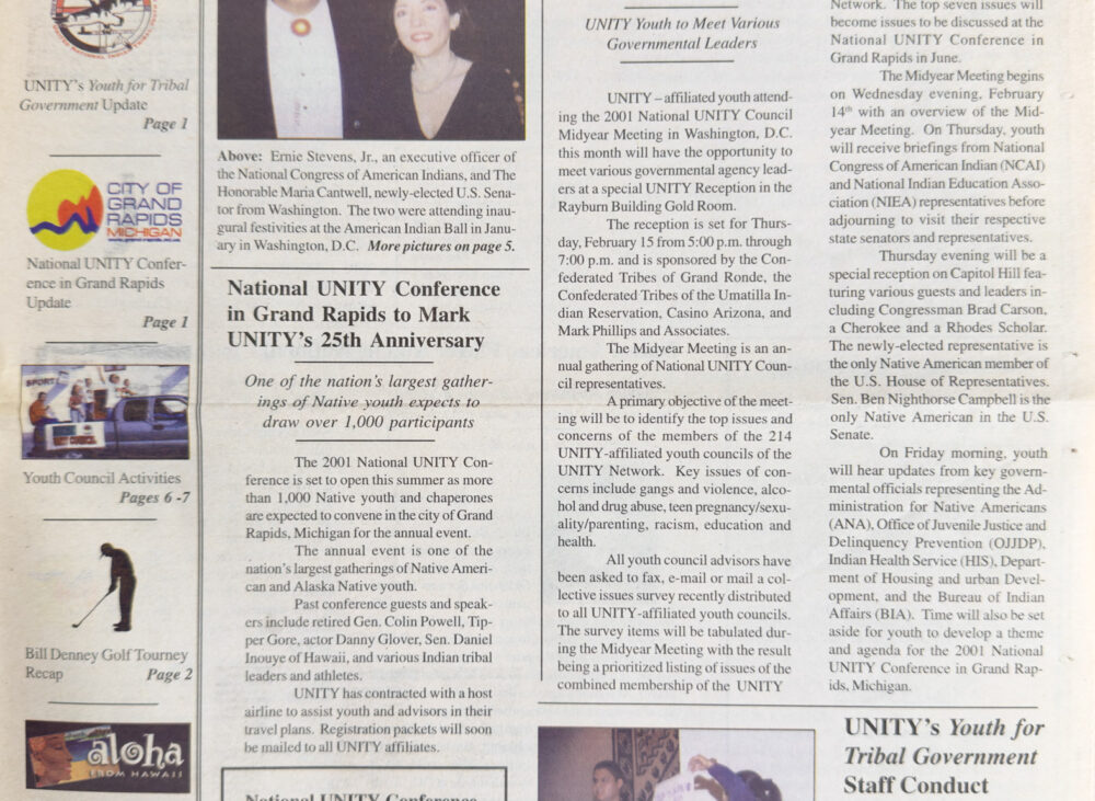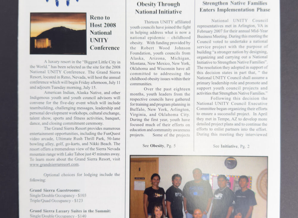 2002 — NUCEC outreach to Alaska Native Youth for creation of youth councils (Tlinget and Haida Tribes) 2003 — Dan Terrio/Kristy Dayson (Co-Presidents) invited to give “State of UNITY Youth” address before Senate Committee on Indian Affairs, Washington, DC 2006 — First Lady’s Luncheon: Four UNITY youths were invited to attend a charity luncheon benefiting UNITY and hosted by First Lady Laura Bush in Washington D.C. The luncheon was themed, “The First Americans.” During the luncheon Tony and Karl Duncan performed Hoop Dances. UNITY Executive Committee members Juanita Toledo and Joshua Tso presented gifts to Mrs. Bush on behalf of the UNITY organization. 2006 — Strengthening Native Families: UNITY conducted a project to combat social issues affecting Indian Country by strengthening Native families. 2006 — Celebrate Native Fitness: Building upon the successful ‘Celebrate Fitness’ project, the Robert Wood Johnson Foundation (RWJF) supported Celebrate Native Health with grants that allowed 13 youth councils to promote efforts within their communities to lower the barriers to healthy eating and physical activity and thereby reduce childhood obesity at community and tribal levels. (2005- 2009) 2008 — NUCEC (Vincent Toya, Jemez) gifted UNITY an Eagle Staff, used in the Opening Day Grand Entries