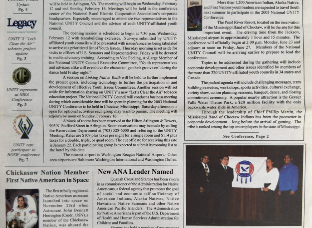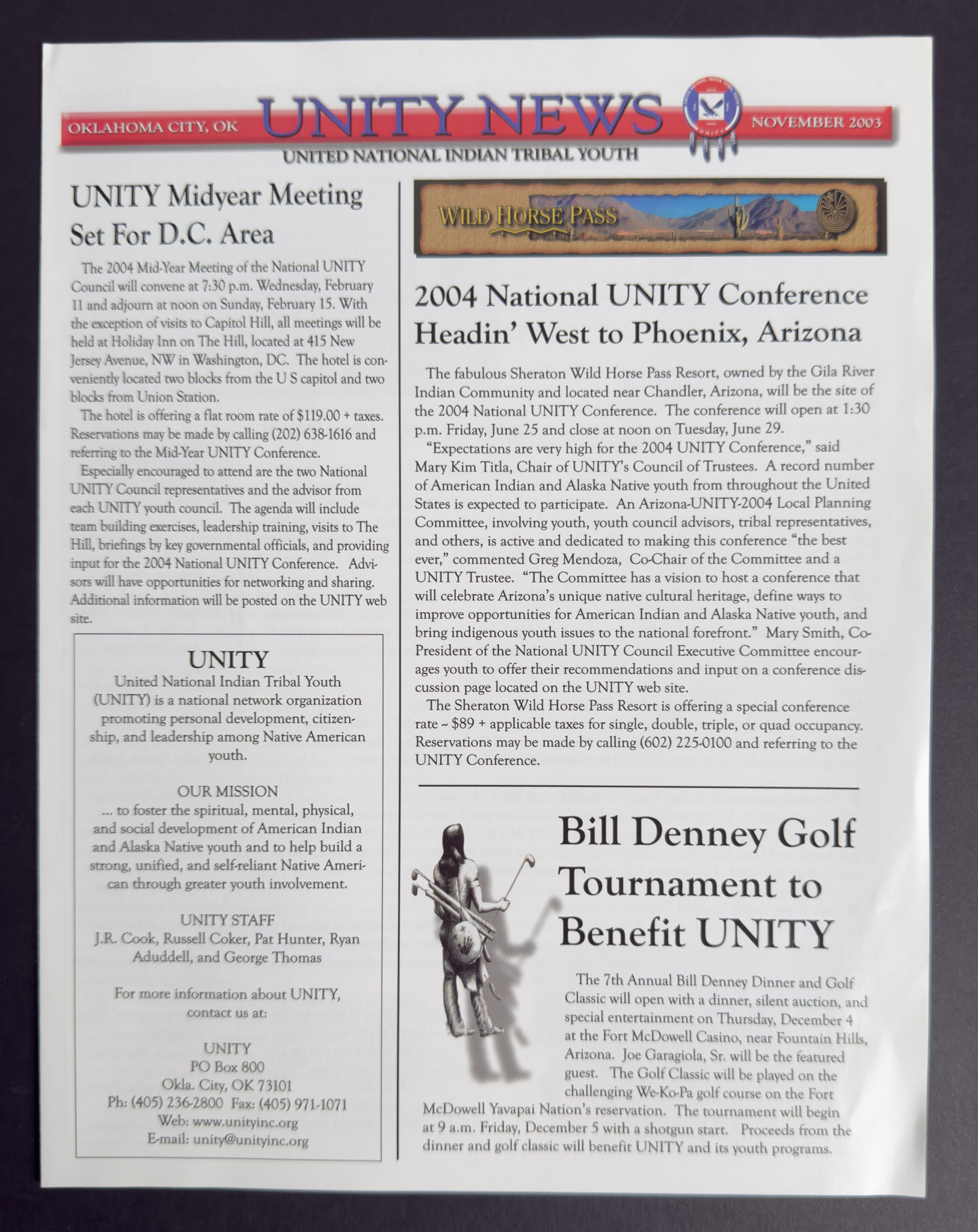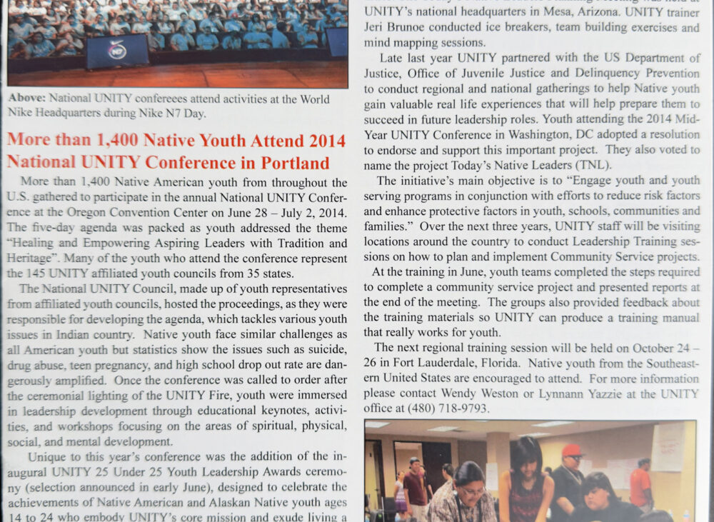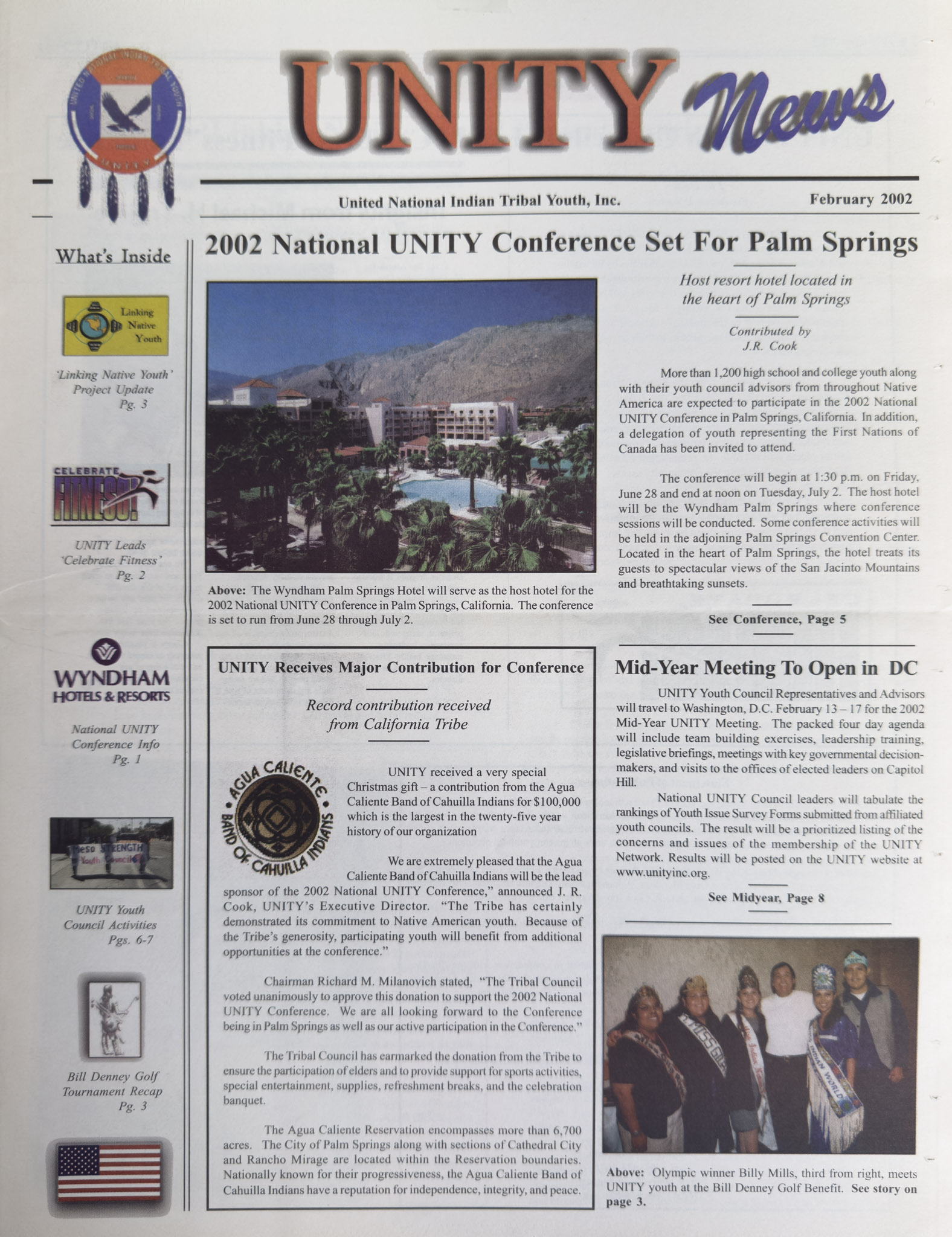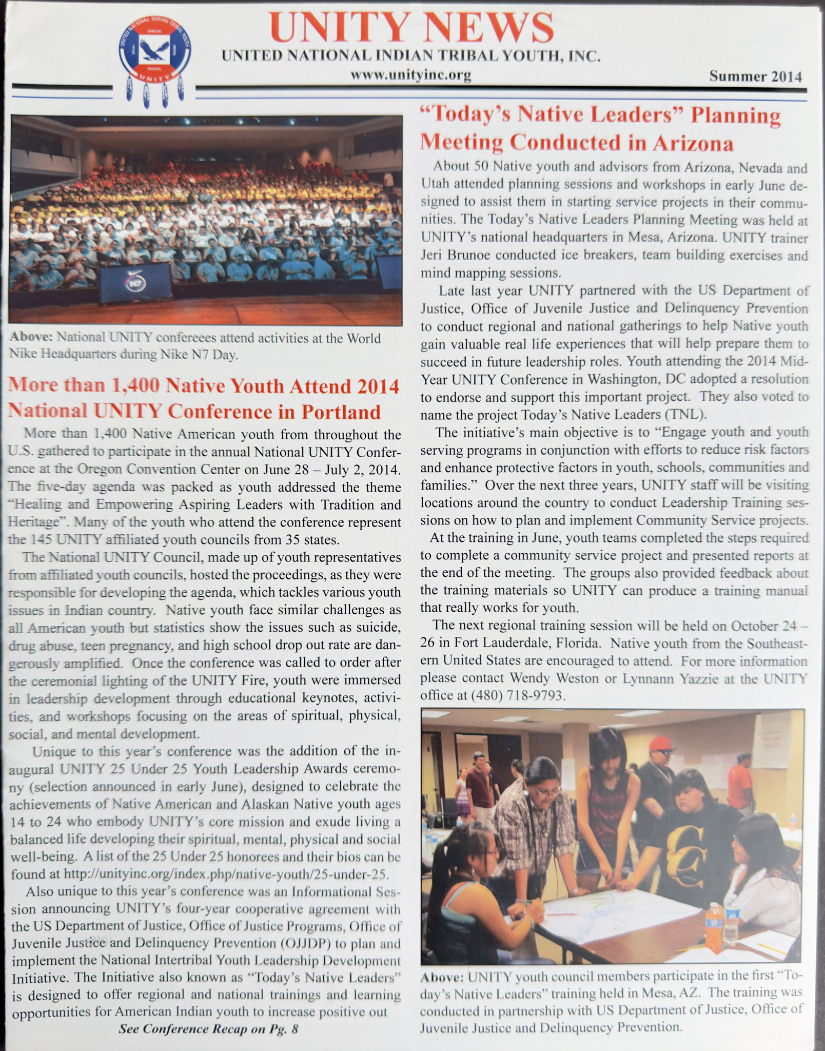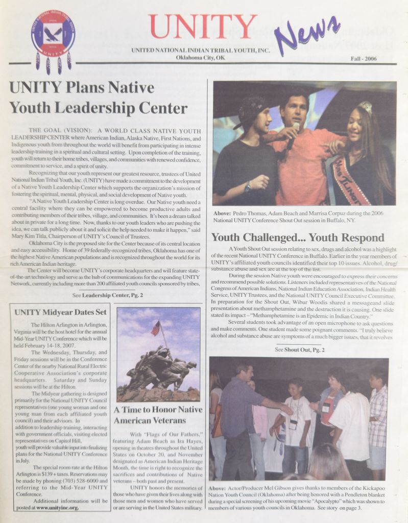 2002 — NUCEC outreach to Alaska Native Youth for creation of youth councils (Tlinget and Haida Tribes) 2003 — Dan Terrio/Kristy Dayson (Co-Presidents) invited to give “State of UNITY Youth” address before Senate Committee on Indian Affairs, Washington, DC 2006 — First Lady’s Luncheon: Four UNITY youths were invited to attend a charity luncheon benefiting UNITY and hosted by First Lady Laura Bush in Washington D.C. The luncheon was themed, “The First Americans.” During the luncheon Tony and Karl Duncan performed Hoop Dances. UNITY Executive Committee members Juanita Toledo and Joshua Tso presented gifts to Mrs. Bush on behalf of the UNITY organization. 2006 — Strengthening Native Families: UNITY conducted a project to combat social issues affecting Indian Country by strengthening Native families. 2006 — Celebrate Native Fitness: Building upon the successful ‘Celebrate Fitness’ project, the Robert Wood Johnson Foundation (RWJF) supported Celebrate Native Health with grants that allowed 13 youth councils to promote efforts within their communities to lower the barriers to healthy eating and physical activity and thereby reduce childhood obesity at community and tribal levels. (2005- 2009) 2008 — NUCEC (Vincent Toya, Jemez) gifted UNITY an Eagle Staff, used in the Opening Day Grand Entries